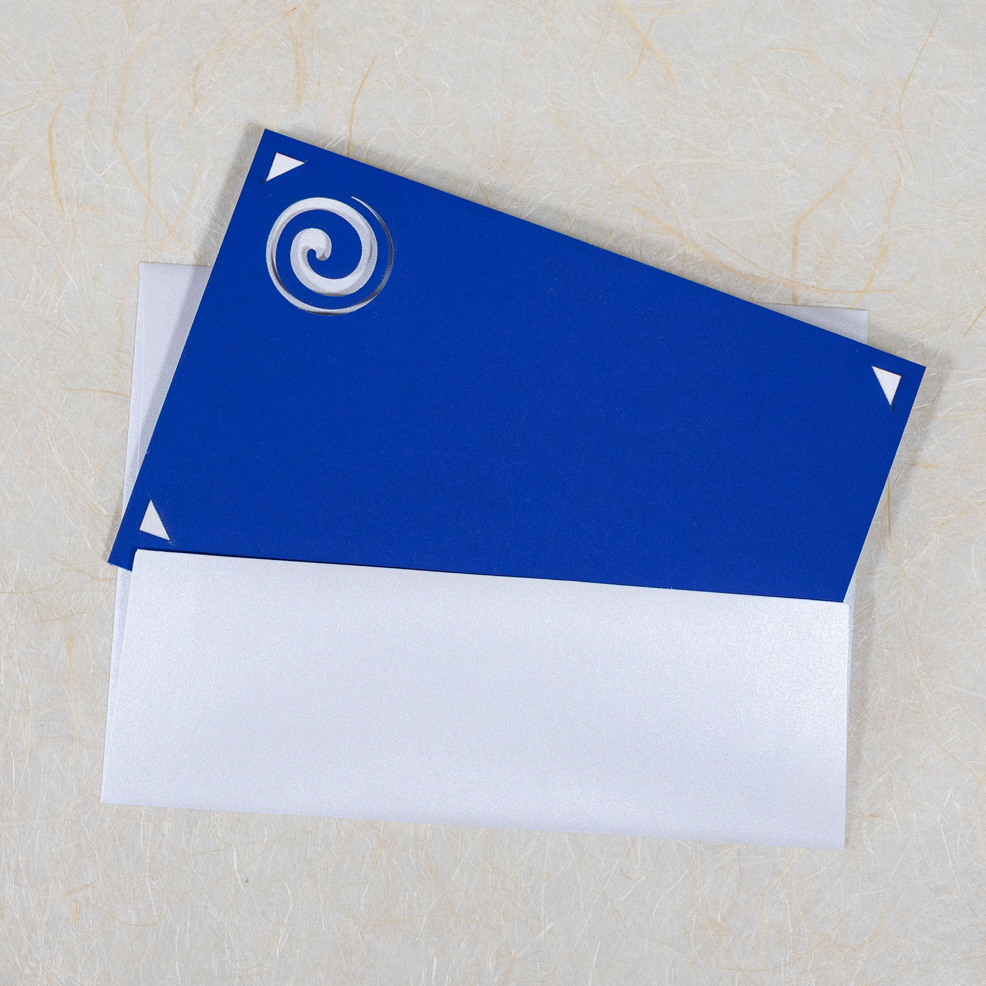 Cut and folded by hand from a wonderful heavyweight stock with a lovely pearlescent sheen. Backed with a sumptuous cobalt blue card with a velvety hand-feel.